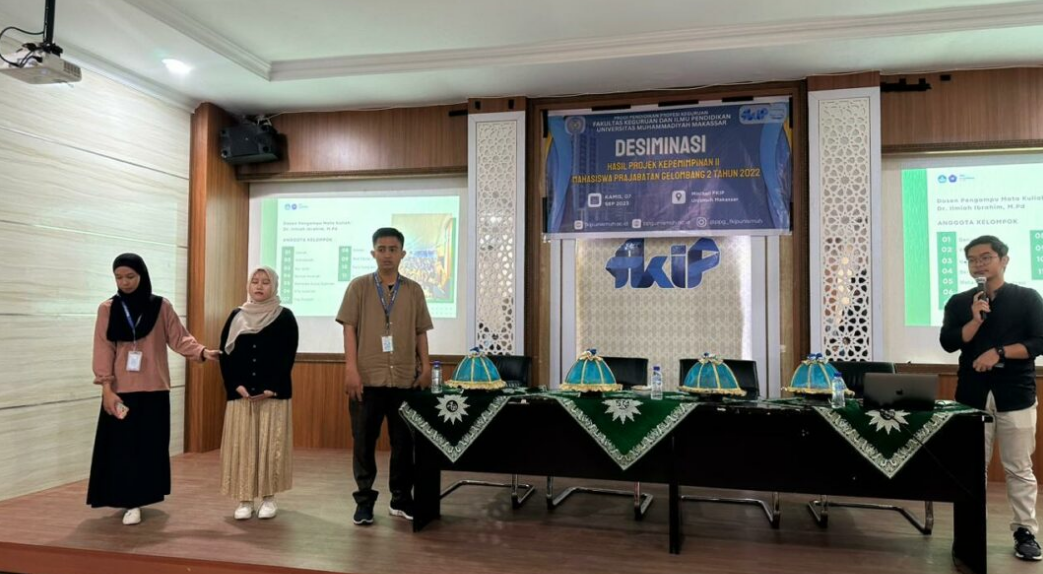 PPG.UNISMUH_ Fakultas Keguruan dan Ilmu Pendidikan (FKIP) Universitas Muhammadiyah (Unismuh) Makassar menggelar diseminasi hasil proyek kepemimpinan mahasiswa PPG Prajabatan Gelombang 2, Kamis, 7 September 2023, di Mini Hall FKIP Unismuh. Acara tersebut dihadiri oleh Wakil Dekan 1 FKIP Unismuh, Dr. Baharullah, MPd, Koordinator PPG Dr. Sukmawati, MPd, mahasiswa PPG Prajabatan Gelombang 2, serta dosen mata kuliah Proyek Kepemimpinan II. Baharullah dalam sambutannya mengemukakan bahwa mata kuliah proyek kepemimpinan bertujuan mengembangkan kemampuan kepemimpinan mahasiswa melalui service learning yang berbasis sekolah atau komunitas. “Melalui proyek ini, mahasiswa dapat mengasah kepekaannya terhadap tantangan pembelajaran peserta didik,” katanya. Sementara itu, Sukmawati memberikan apresiasi atas kreativitas dan inovasi mahasiswa dalam pengembangan proyek. “Dalam pengembangan proyek yang telah dihasilkan oleh mahasiswa sangat kreatif dan inovatif terbukti dengan hasil projek yang telah dihasilkan akan diadopsi oleh sekolah lokasi PPL-nya,” ungkapnya. Sumber (https://porosmaju.com/fkip-unismuh-tampilkan-inovasi-mahasiswa-dalam-proyek-kepemimpinan-mahasiswa-ppg-gelombang-2/)